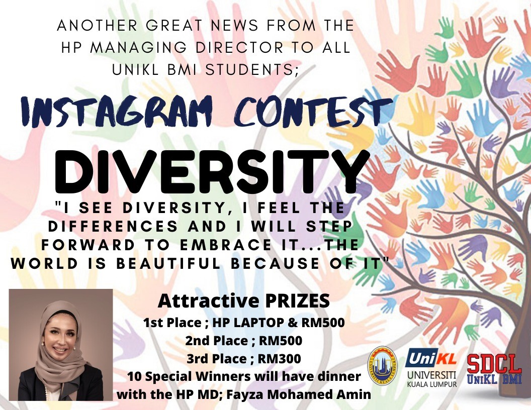 In collaboration with UniKL BMI CSR conducted by *SDCL of UniKL BMI*, *Fayza Mohamed Amin*, an ITM alumni who is currently the Managing Director of HP, looks forward to extend the notion of the world being a better place if everyone understands the concept of embracing diversty, respects every member of the community and values each other’s differences. Therefore, we are proud to announce another great *INSTAGRAM CONTEST for UniKL BMI Students ONLY.*