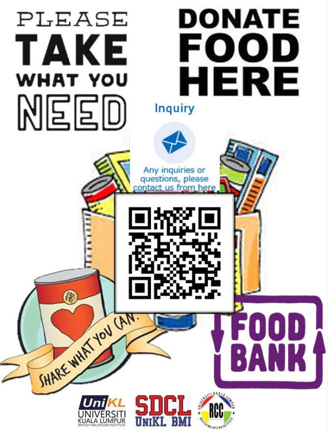 UniKL BMI RCC and Fellows have just initiated another UMI (UniKL MEAL INITIATIVE) Project called Food Bank @ Gerobok Rezeki. Placed at the Residential College walkway near the Student Lounge, our Siswa and Siswi can TAKE or DONATE food (biscuits/coffee tea sachets/instant noodles/snacks etc) if they are HUNGRY. Let’s pray that this project will be successful and will benefit all our Siswa and Siswi. To those who would like to contribute, pls contact Sir Roy, Sir Irwan or you can just scan the QR code in the poster. (For info; UniKL BMI has been carrying out BFF – BMI Food Favour on a DAILY basis for 7 semesters and we also have RFF – RCC Food Favour where the Fellows and RCC will cook once a month for our siswa and siswi). Let’s all support these projects and we pray that all involved will be rewarded accordingly.